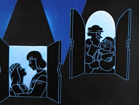Строчки, хорошо описывающие этот эффект, когда свет «коснулся крыш». В этой ночной сцене мы видим персонажей во тьме со светлыми линиями, или, наоборот, темные линия на светлом фоне. И там и там это необходимое решение для передачи настроения и душевных волнений персонажа Трубадура.