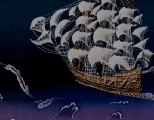 Выше две сцены, где показывается дуновение ветра. В первом он показывается как «черный шум», быстро проскользнувший по парусам, а во втором он ковриком из снежинок нежно пролетает по воздуху. В первом мы чувствуем порыв и конфликт, во втором безмятежность и спокойствие.