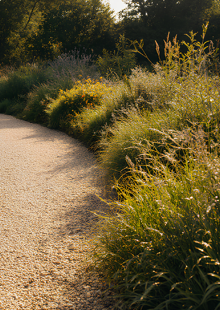 Тропинки обрамлены высокой травой с обеих сторон, как бы отделяя зоны сада от самих дорожек, давая чувства защищенности и некого уюта.