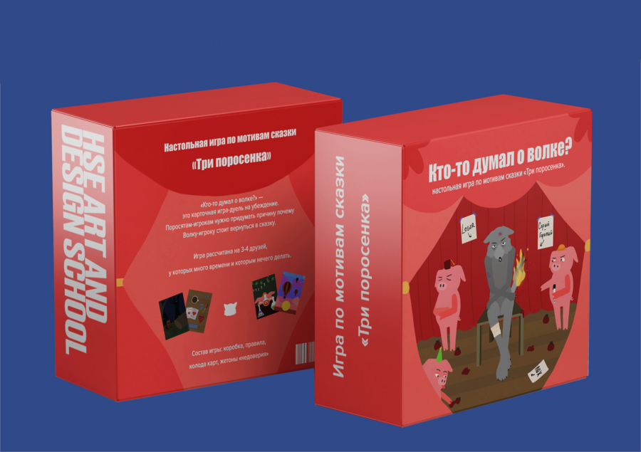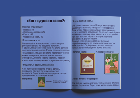 «Кто-то думал о волке?» — это карточная игра-дуэль на убеждение. Поросятам-игрокам нужно придумать причину почему Волку-игроку стоит вернуться в сказку. Победа или поражение будет зависеть от решения волка, ведь если он уйдет, поросята проиграют.