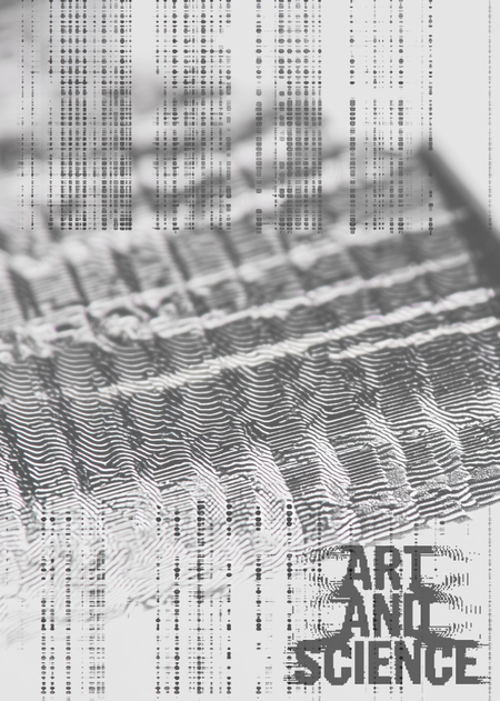 A distressed digital art piece featuring the words «art and science» rendered in bold black ASCII characters against a stark white background. The text appears fragmented and glitched, with sections breaking apart into ascii simbols that create a deteriorated, corrupted data aesthetic. subtle moiré interference pattern creates rippling wave-like distortions across the composition, adding visual tension and movement. The overall effect combines generative graphic aesthetics with modern Field Wave Interference sensibilities, creating a striking monochromatic design that bridges analog and digital visual languages.