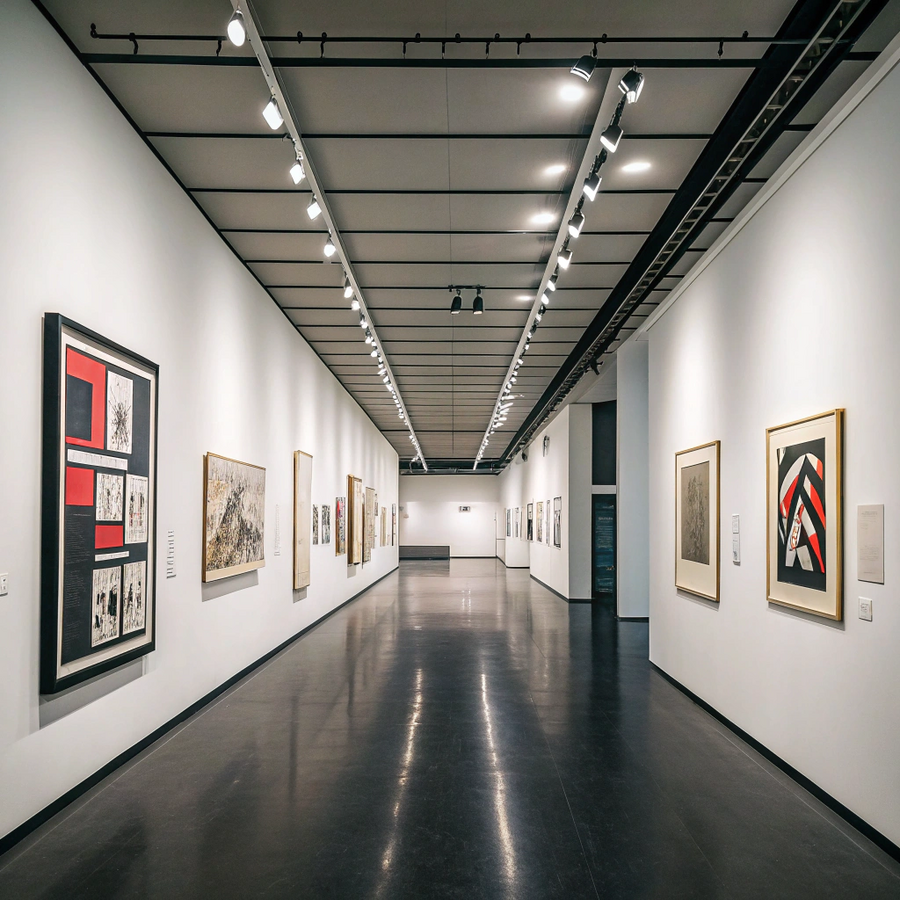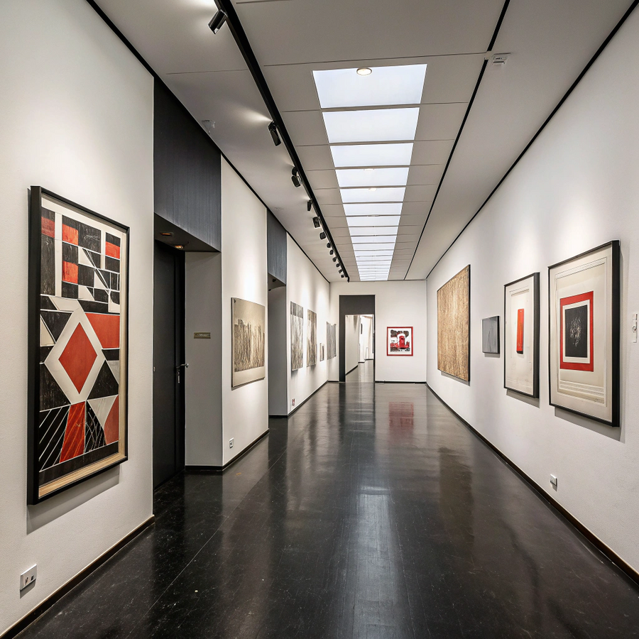 - Recraft Промт 1 (пространство, сгенерированное ИИ; 2 изображения): The interior of the avant-garde art exhibition dedicated to El Lissitzky is a minimalist space inspired by his work. The floor is dark, slightly reflective, and the ceiling is light with track lightning system and walls are light. El Lissitzky’s paintings in dark frames hang along the sides of the corridor.