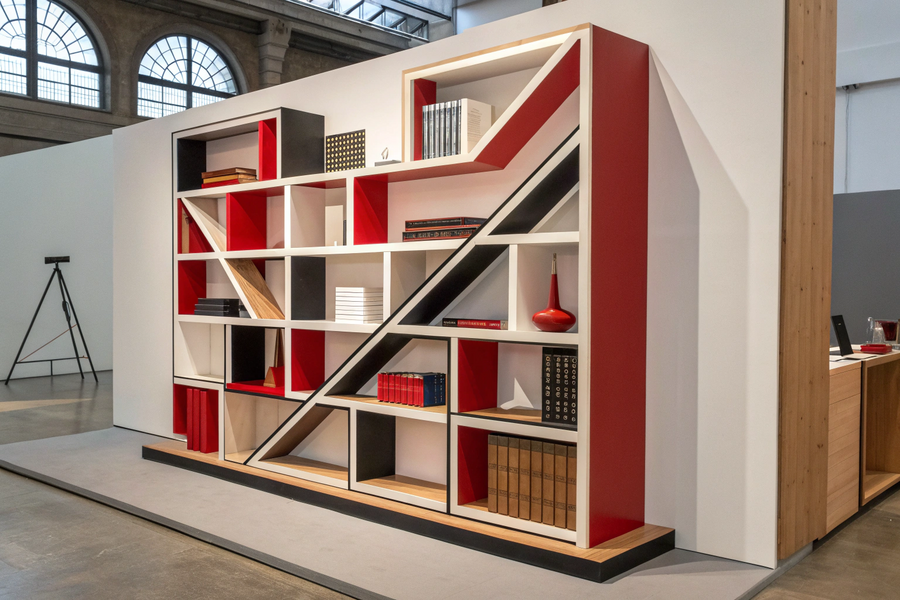 Промт 3 (книжный шкаф): A conceptual bookshelf inspired by El Lissitzky’s constructivist aesthetics. Geometric and architectural composition with asymmetrical forms, clean lines, and a dynamic arrangement of shelves. Use a limited color palette: red, white, black, and natural wood. The object should look both functional and sculptural, like a piece of modernist architecture in an art exhibition setting.