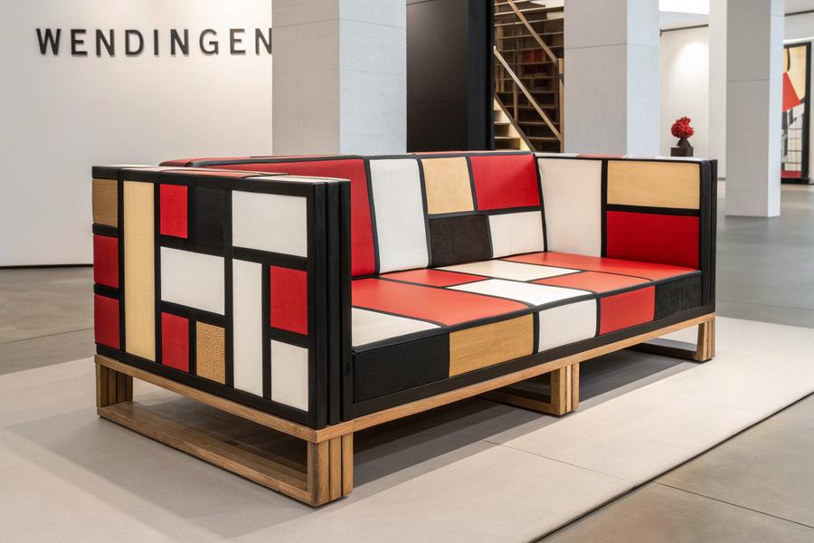 Промт 2 (мягкий диван): A conceptual art sofa designed in the style of El Lissitzky. Constructivist design with geometric shapes, intersecting planes, and bold contrasts of red, black, white, and wood tones. The sofa should look like an architectural sculpture — dynamic, modular, and abstract, blending furniture design and art installation. Minimal background, exhibition lighting, modern gallery setting.