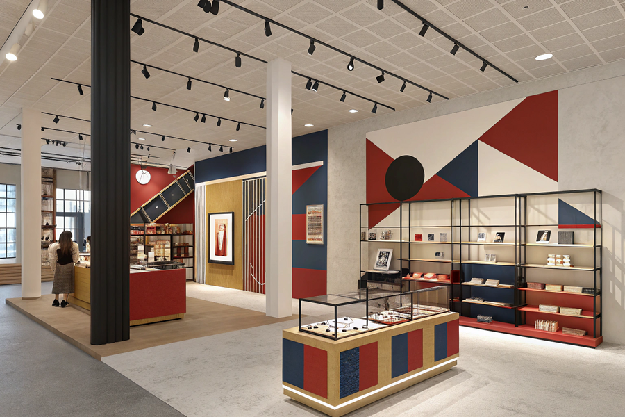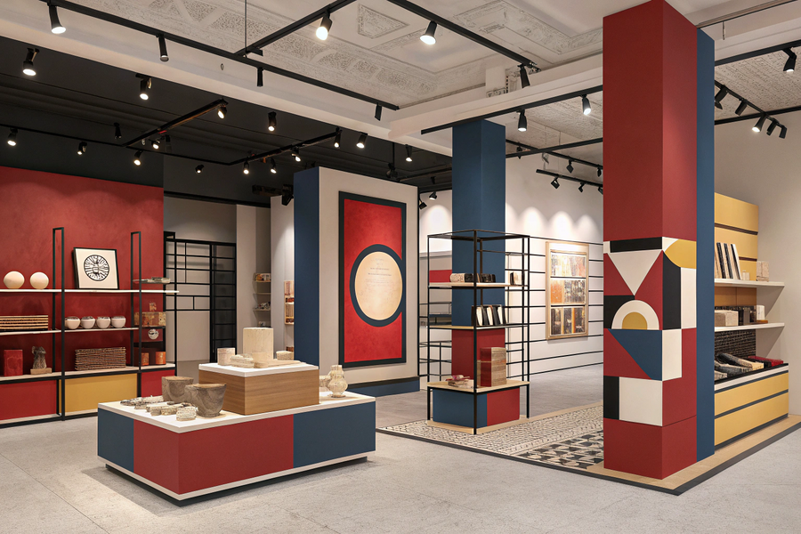 - Recraft Промт (2 изображения): An art store interior inspired by El Lissitzky’s constructivist design. The space sells merchandise related to an art exhibition. The interior features geometric architecture, bold shapes, and asymmetrical compositions. Color palette: deep red, black, blue, and off-white tones. Display stands and shelves are sculptural and modular, resembling constructivist structures. Lighting is modern and directional, highlighting the products as art pieces. The atmosphere is minimalistic yet expressive, merging art, design, and commerce.