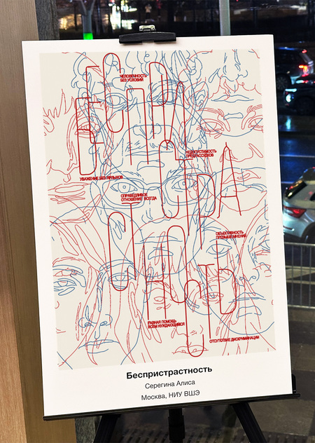 Плакаты анализируют понятие беспристрастности, но через разные пути: в первой работе я использовала наложение разных лиц людей, чтобы показать, что все разные, но при этом равны и заслуживают одинакового к себе отношения. Во втором плакате принцип отображен через буквы, которые обретают расплывающиеся формы и соединяются с силуэтами разных лиц людей, что показывает, что все люди способны жить в согласии и любви, если будут придерживаться принципов беспристрастности