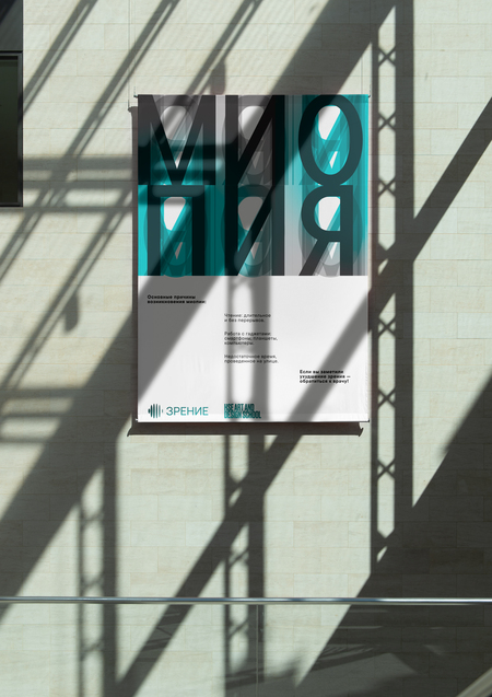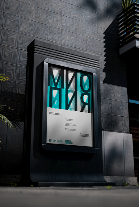 На плакате описаны основные причины возникновения миопии. Само искажение зрения я решила передать, используя наложение букв друг на друга как метафору невозможности их распознать, что часто происходит при проверке зрения с помощью оптометрической таблицы.