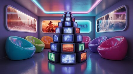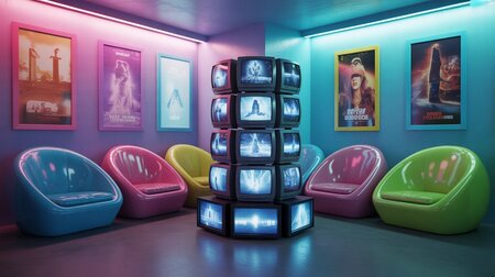 промпт зона ожидания: waiting area of a Y2K time travel agency. Bubble chairs in bright colors (aqua, hot pink, lime green). Walls are decorated with oversized holographic posters of famous movie locales. A pyramid of stacked CRT televisions displays snippets of various sci-fi and fantasy movies. Lighting consists of color-changing LED strips. Seating has rounded corners and is made of translucent or transparent plastic.
