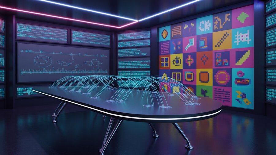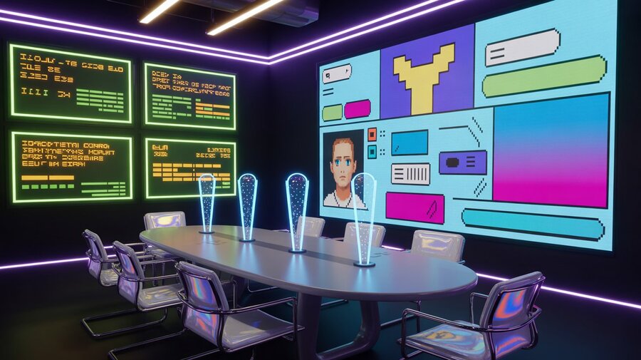 промпт конференц-зал: conference room of a Y2K-style time travel agency. The room features a large, oval-shaped table with built-in holographic projectors. The walls are covered in digital displays showing real-time data about different timelines and cinematic universes. The lighting is a mix of neon and spotlights, creating a dramatic atmosphere. a wall is covered in graphic elements, vector graphics and pixel-art reminiscent of the early web-design and game console GUI’s