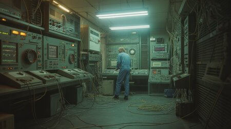промпт комната для калибровки временного оборудования: technical calibration room in a Y2K time travel agency. A chaotic mix of vintage and futuristic equipment: oscilloscopes, circuit boards, and holographic analyzers. Wires and cables are strewn across the floor. A lone technician in a futuristic jumpsuit fine-tunes the temporal calibration settings. Emergency lights flicker, casting an eerie glow. The room should look both high-tech and slightly rundown.