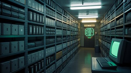 промпт архив с пленками/данными: archive room of a Y2K time travel agency. Rows of shelves lined with film canisters, hard drives, and other data storage devices. The room is dimly lit with flickering fluorescent lights, creating an eerie and mysterious atmosphere. In this area include elements reminiscent of the Matrix. A terminal station with a keyboard and glowing-green CRT screen is placed by the opposite wall.