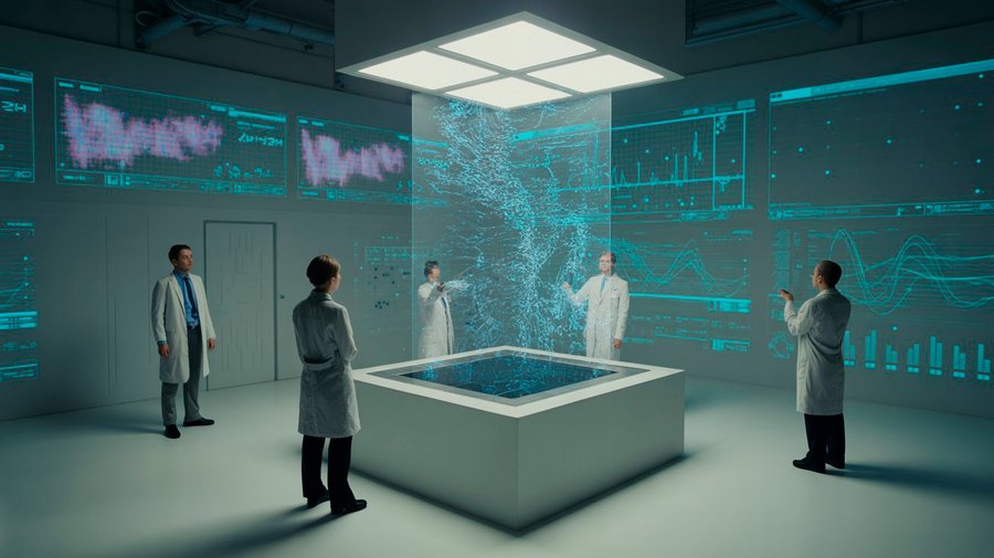 промпт комната моделирования временных парадоксов: simulation room for temporal paradoxes in a Y2K time travel agency. The room is a stark white cube with a holographic projector in the center. A team of scientists in lab coats monitors the simulation, which depicts a chaotic and distorted timeline. The lighting is harsh and clinical, highlighting the seriousness of the situation. Include lots of screens with graphs, equations and pixelated alerts.