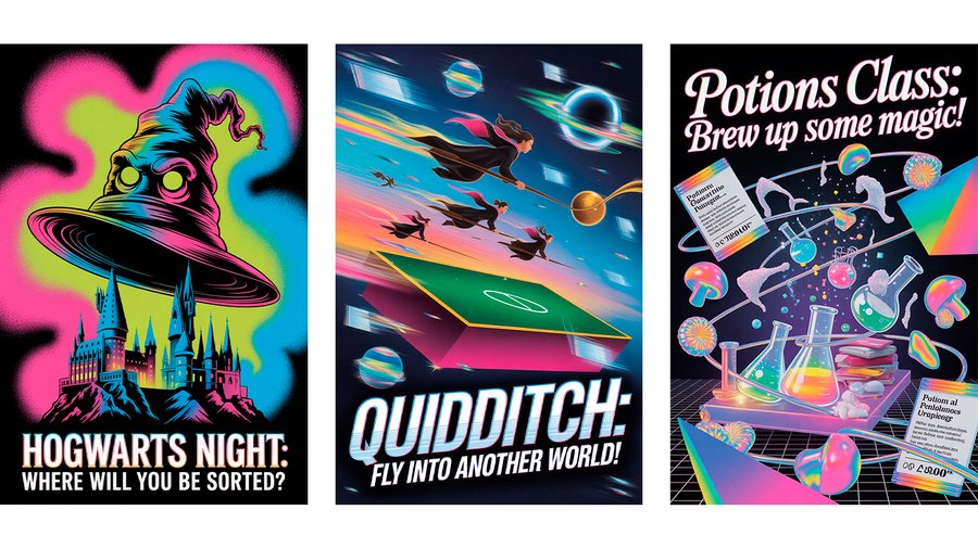 A surreal, slightly distorted rendering of Hogwarts castle silhouetted against a swirling, neon-colored nebula. Above the castle, a floating, exaggerated Sorting Hat with glowing eyes and a slightly unsettling expression. Elements should appear to be shimmering or glitching. Text: «Hogwarts Night: Where will you be sorted?». Style: Dreamy, magical, unsettling, Y2K aesthetic, bold typography, with a focus on color gradients and surreal shapes.
