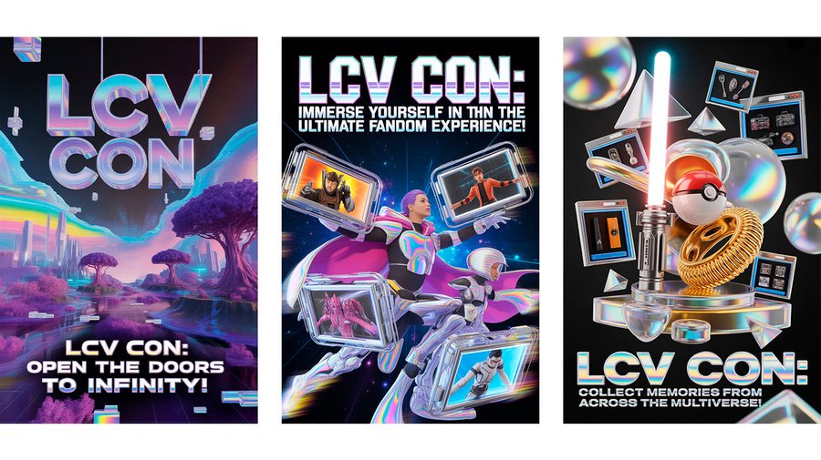 A collage featuring dynamic 3D renderings of various figures in elaborate cosplay costumes, inspired by popular cinematic universes. Surround them with floating screens displaying snippets of lectures and masterclasses. Chrome accents and digital glitches should be prominent. Text: «LCV Con: Immerse yourself in the ultimate fandom experience!». Style: Energetic, dynamic, 3D, Y2K aesthetic, with a focus on iridescent textures and chrome details.