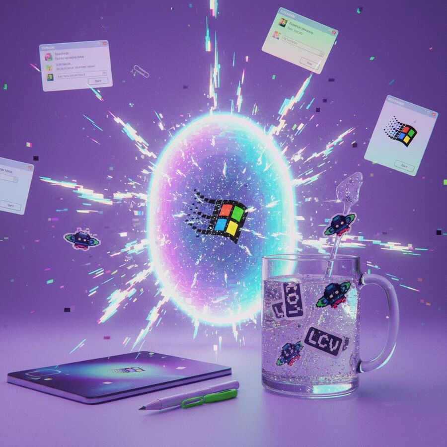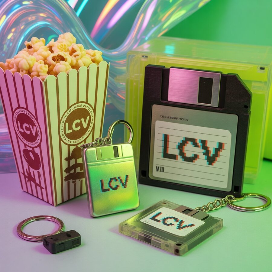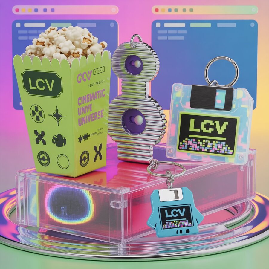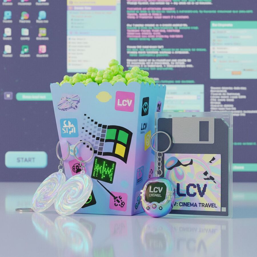 Сюрреалистичное фото фирменного стиля для турагентства LCV, специализирующегося на путешествиях в киновселенные. Яркий набор фирменных предметов, расположенных на фоне, имитирующем интерфейс ранних 2000-х. В композиции: коробка с попкорном кислотного цвета, стилизованная под Windows XP, с логотипом LCV и иконками из разных киновселенных, брелки в виде переливающихся порталов, брелки в виде глитчащих тамагочи с логотипом компании, а также винтажная дискета в прозрачном пластиковом кейсе с наклейкой в стиле Y2K. Композиция подчеркивает сюрреализм, яркие цвета и ностальгию по технологиям начала 2000-х. Цветовая палитра: кислотные оттенки, неоновый розовый, переливающийся хром и пастельные тона. Общее настроение: игривый, ностальгический, футуристический и полный сюрпризов Y2K.