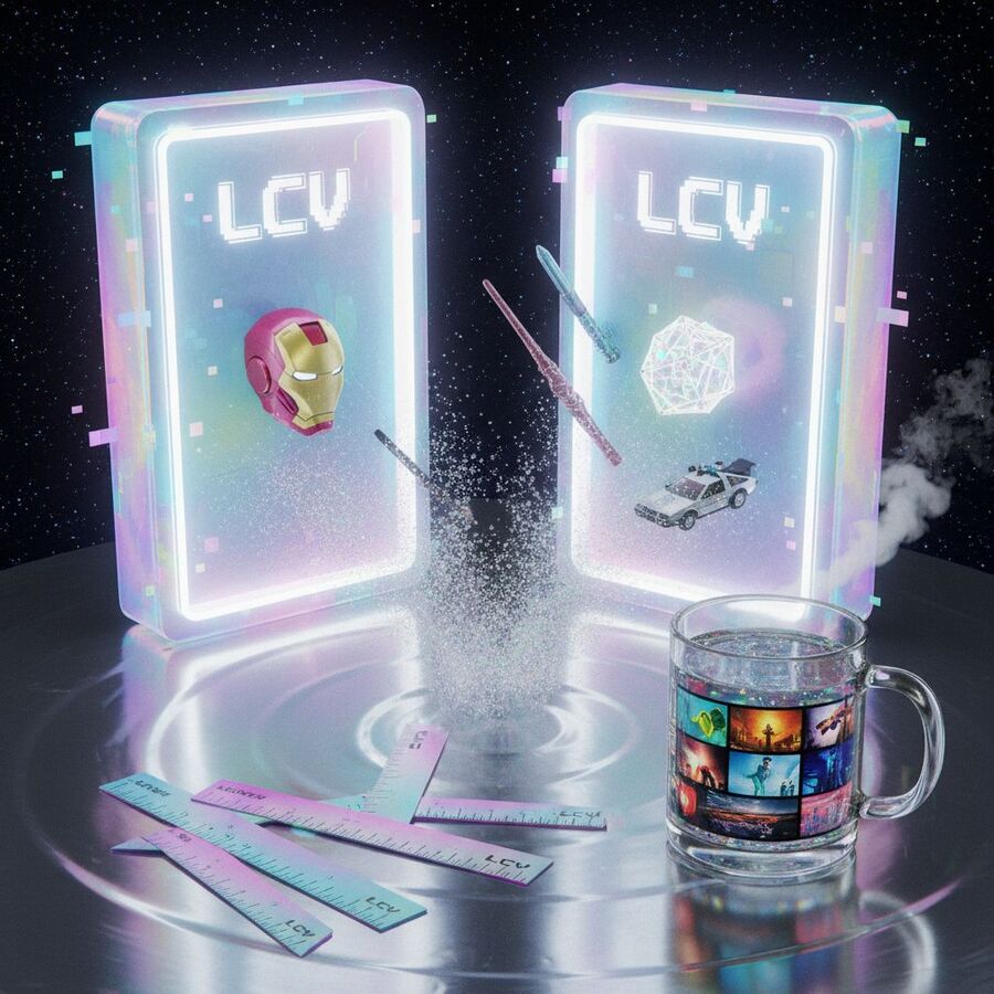 A deconstructed still life featuring artifacts from different cinematic universes (e.g., a lightsaber, a Pokeball, a ring from Lord of the Rings), rendered in a hyper-realistic yet slightly distorted 3D style. Surround them with iridescent geometric shapes and floating windows showcasing souvenirs from the LCV Con marketplace. Text: «LCV Con: Collect memories from across the multiverse!». Style: Surreal, detailed, 3D, Y2K aesthetic, emphasizing realistic rendering with a surreal twist and prominent chrome elements.