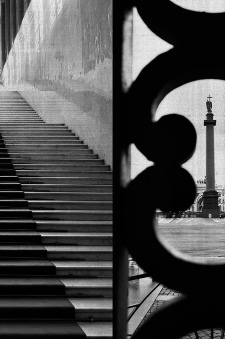 Серия фотографий предлагает взглянуть на Эрмитаж не только как на музей, но и как на величественную ритмичную структуру. Здесь акцент смещается с самих экспонатов на их пространственное размещение, исследуя визуальный ритм, создаваемый лестницами, которые ведут к произведениям искусства.