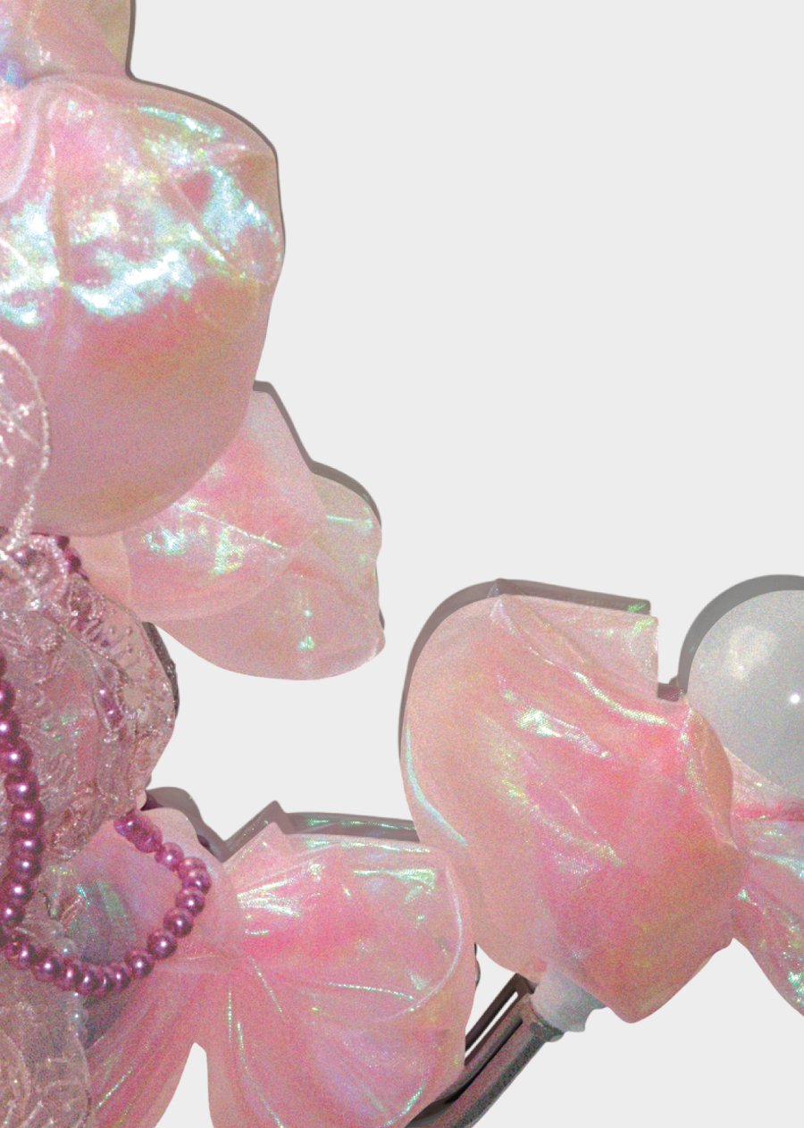 Люстра строится на столкновении двух природ — жёсткой рациональности конструкции и мягкости живого материала. Металлический каркас — это модель системы, структуры, нормы. Он — безупречно выверенный, правильный, холодный. Ткань, напротив, — телесная, непредсказуемая, не вписывающаяся в форму. Она не подчиняется углам, она обволакивает, скрывает, иногда даже подавляет каркас.