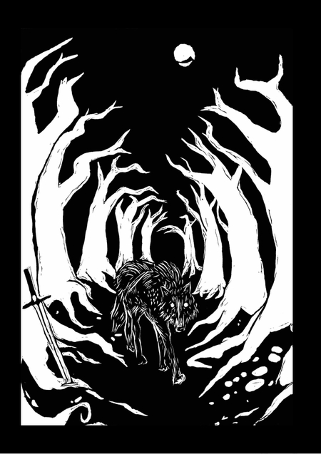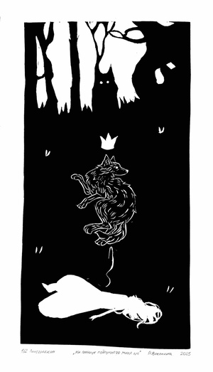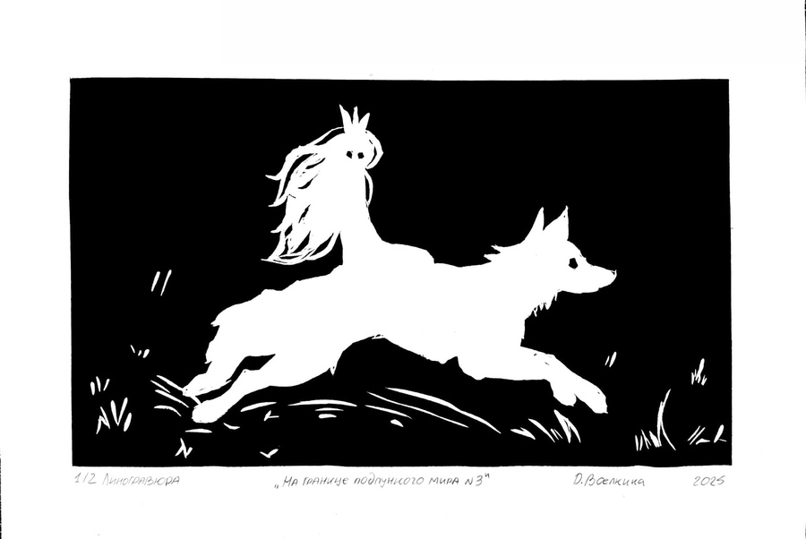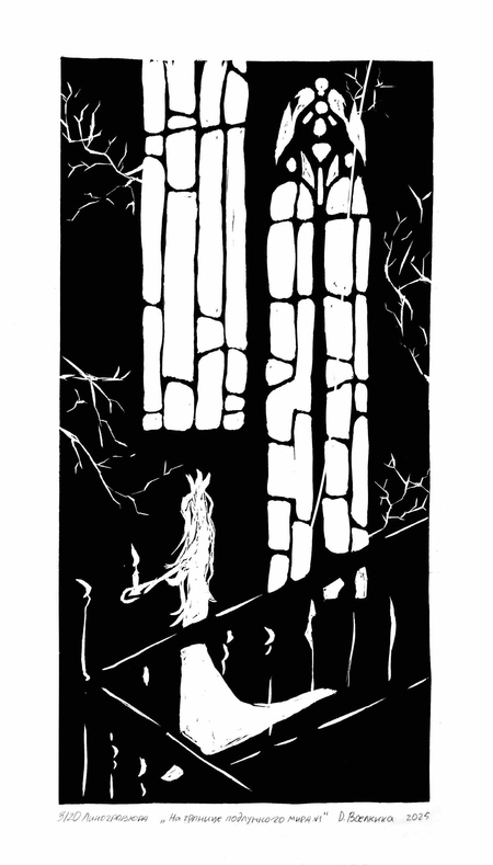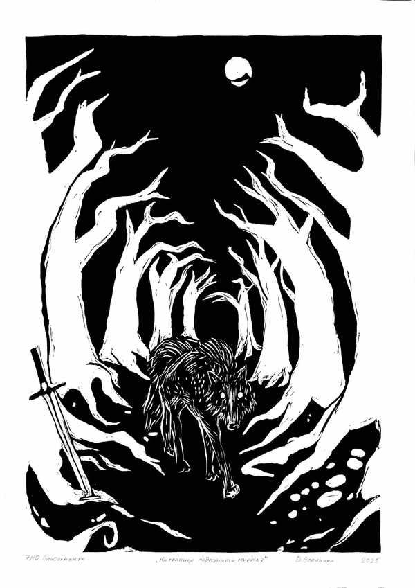 Работая в технике линогравюры, я старалась через чёткий контраст чёрного и белого подчеркнуть идею внутреннего перехода, границы между мирами и состояниями.