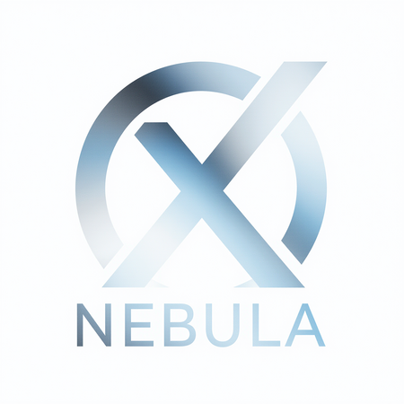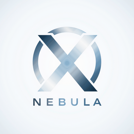 текстовый промпт // Minimalist logo design for a brand named «NEBULA». The logo features a geometric symbol «X» which is rotated 45 degrees and has a round halo or ring surrounding it. The cross is rendered in light futuristic shades: iridescent silver, luminous white, and ethereal pale blue with a subtle gradient. The text «NEBULA» is positioned below the cross, set in a sleek, modern computer-style font in a light blue color. The entire composition is clean, sophisticated, and placed on a pure white background.