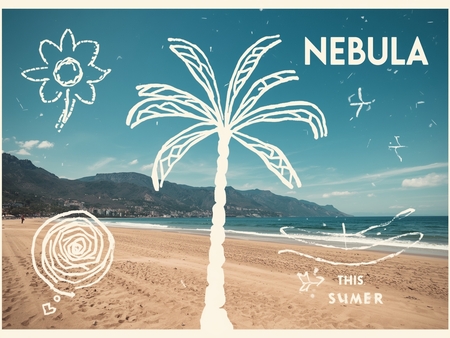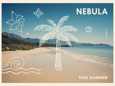 текстовый промпт // Vintage travel poster design featuring a completely photorealistic, unaltered photograph of a natural beach and mountains under a clear blue sky. The beach image must appear completely realistic with no stylistic alterations, maintaining natural colors, textures, and lighting as seen in real life. Overlaid on this authentic photographic background are simple, hand-drawn white illustrations: a stylized palm tree with wide leaves in the center, a flower/star shape in the upper left corner, a spiral in the lower right corner, and wavy lines in the lower left. The composition is enclosed by a thin white border. The text «NEBULA» in the upper right and «THIS SUMMER» at the bottom appear as if hand-drawn with white ink. The poster maintains a minimalist aesthetic by combining absolute photorealism of the beach scene with contrasting white graphic elements.
