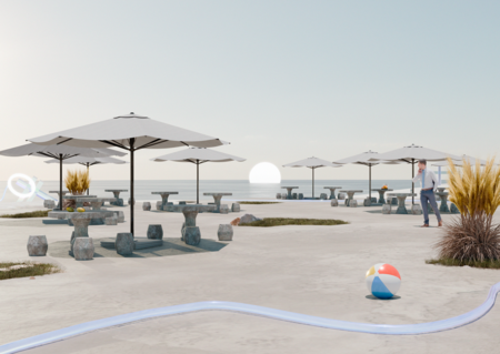 текстовый промпт // Hyperrealistic photo of a serene, minimalist beach at sunrise. A flat concrete patio area with round stone tables and rough-hewn stone stools, each under a large, light-colored beach umbrella. A man in a business suit and shirt stands on the right. In the foreground, a colorful beach ball lies on the ground next to decorative clumps of grass. Small green islands and decorative rocks are scattered across the patio; a glowing linear tube or path light lines the edge of the scene. The vast ocean and a low sun create an even horizon. Calm atmosphere, soft glowing light, muted pastel color palette, shot on Hasselblad, 8K, cinematic lighting.