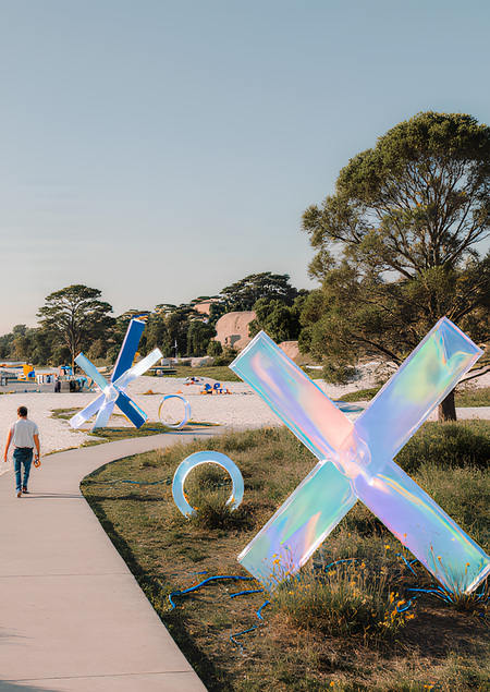 текстовый промпт // Fine art photography of a serene coastal landscape at dawn. A long, straight minimalist concrete path extends to the horizon, dividing the scene. Lush white mounds with delicate yellow flowers and low grass flank the path. On the right, a majestic pine tree and green bushes. The shoreline features a series of futuristic art installations: translucent, iridescent geometric shapes including crosses, rings, and tilted panels, shimmering with a pearlescent glow. The calm sea perfectly mirrors the soft, pale blue sky. Tiny human figures stroll along the path, emphasizing the vast scale. The composition evokes deep tranquility and a harmony between nature and modern art. Shot on a Hasselblad, cinematic lighting, hyperrealistic, 8K