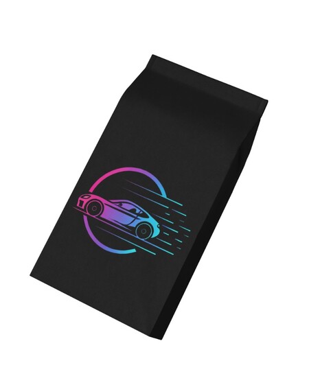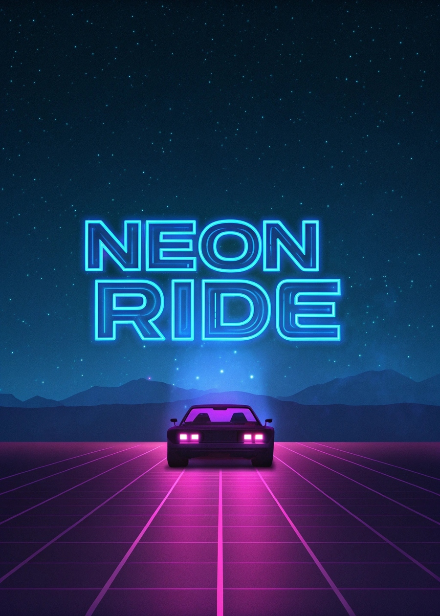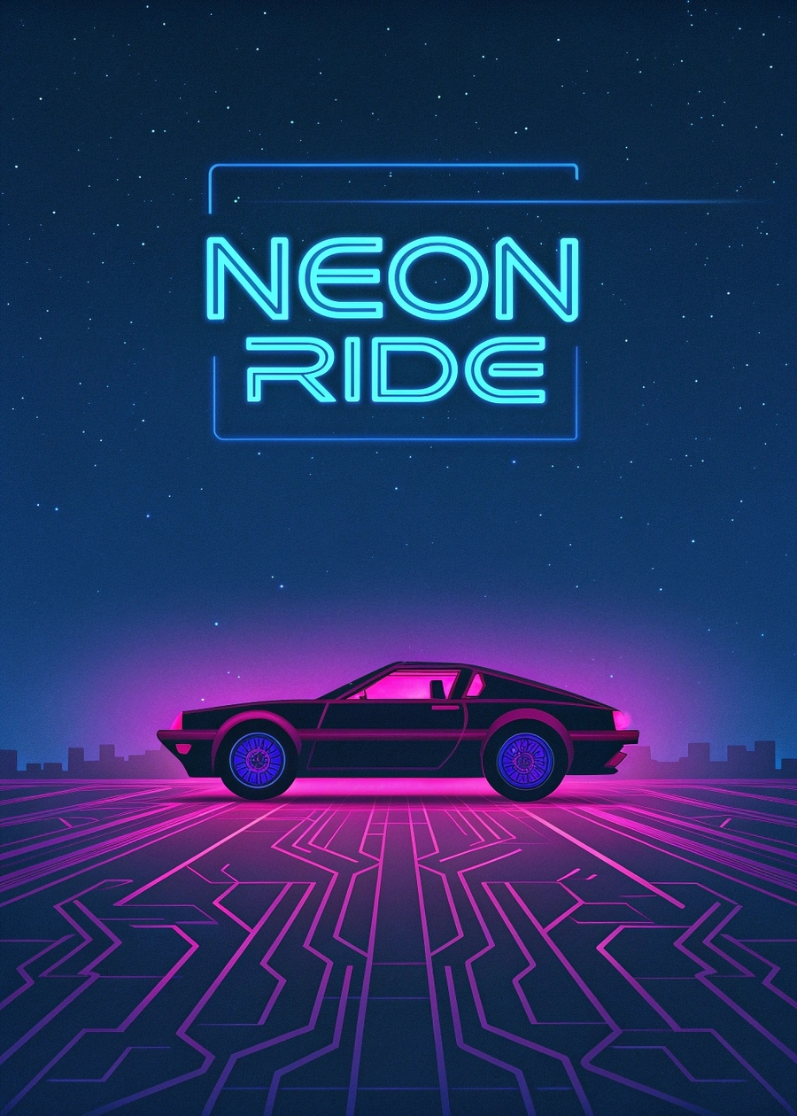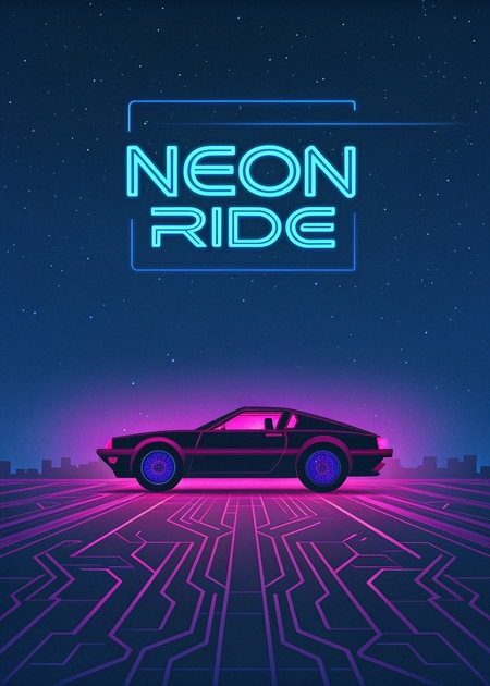 minimalist poster, silhouette of a car made from glowing city map lines, dark background, cyberpunk, neon blue and purple, slogan «NEON RIDE» integrated into the design --ar 3:4