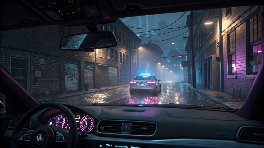 3. cinematic video game scene, first-person view from inside a car hidden in dark narrow alley 0C0B26, engine turned off, rearview mirror showing police car with glowing blue sirens 1A14D9 slowly passing by the alley entrance, rain droplets on windshield, tense atmosphere, stealth gameplay moment, interior dashboard lights casting magenta glow F20F62, highly detailed --ar 16:9 --style raw
