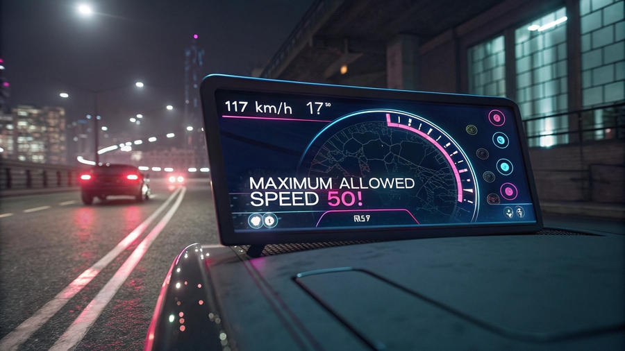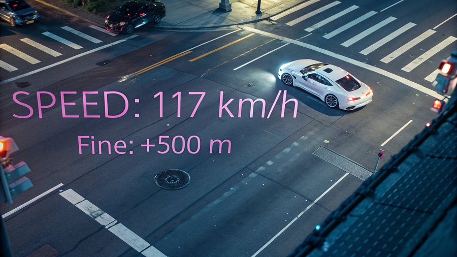 2. security camera footage style, overhead view of city intersection at night, sports car blurring through frame at high speed, digital overlay showing «SPEED: 117 KM/H» in large magenta text F20F62, «FINE: +500 M» notification, timestamp in corner, grainy surveillance aesthetic, dark blue color palette 140F8C, video game UI elements --ar 16:9 --style raw