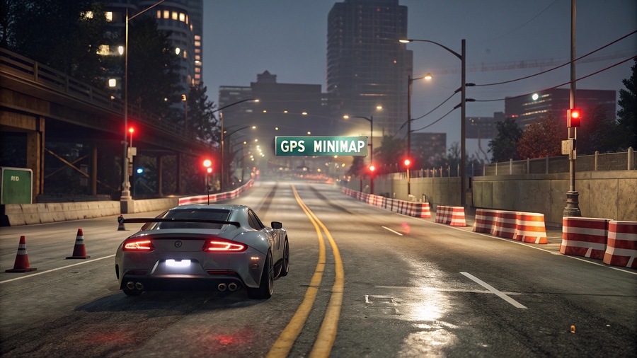 1. in-game cinematic shot, sports car approaching fork in road: left path shows open highway with police checkpoint ahead, right path shows dangerous shortcut through construction site with obstacles, GPS-style minimap overlay showing both routes, player at decision point, night urban environment --ar 16:9