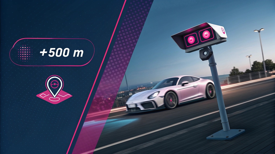 4. infographic style illustration, video game UI showing risk-reward system: left side — sports car speeding past traffic camera with «+500 M» penalty notification, right side — player’s money balance decreasing, color-coded alerts in magenta F20F62 for penalties, dark blue 0C0B26 background, modern gaming infographic --ar 16:9 --style raw