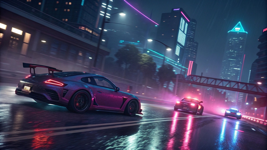 4. dynamic third-person view video game screenshot, a sleek sports car drifting around sharp corner in neon-lit city at night, two police cars with intense red and blue sirens F20F62 1A14D9 in close pursuit, long light trails, motion blur effect, rain-slicked streets reflecting neon lights, cyberpunk atmosphere, dark color palette with vibrant magenta and blue accents, unreal engine 5, cinematic lighting --ar 16:9 --style raw