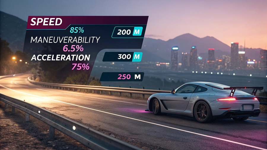 2. game upgrade screen UI, car stats displayed: Speed ████████ 85%, Maneuverability █████ 65%, Acceleration ███████ 75%, upgrade buttons with prices «200 M» «300 M» «250 M», neon progress bars in magenta F20F62 and blue 1A14D9, professional game HUD design --ar 16:9