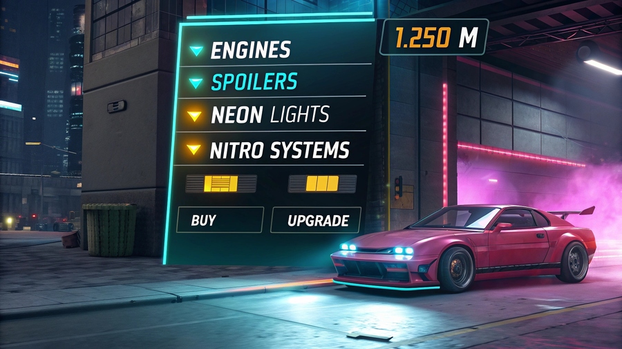 1.in-game customization menu, car parts selection interface: engines, spoilers, neon lights, nitro systems, each with price tags in millions, «BUY» and «UPGRADE» buttons highlighted, currency display «1,250 M» in corner, cyberpunk styling with vibrant colors --ar 16:9