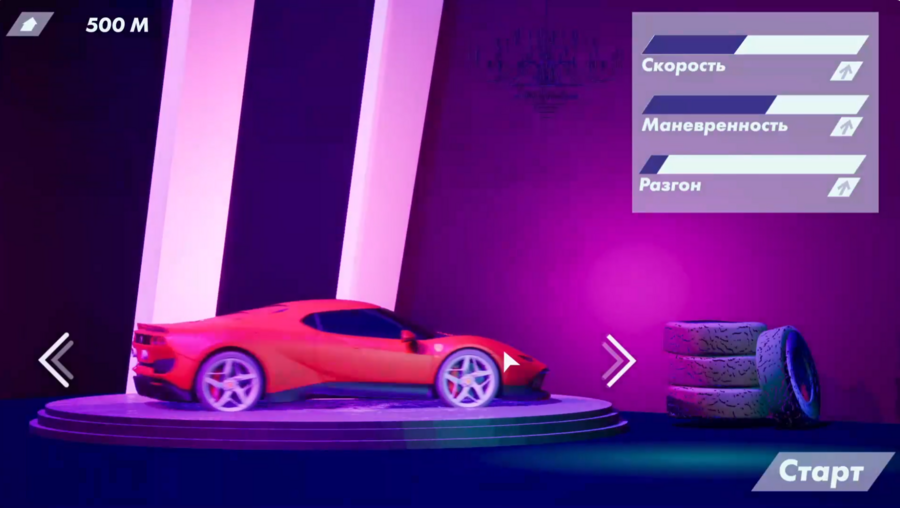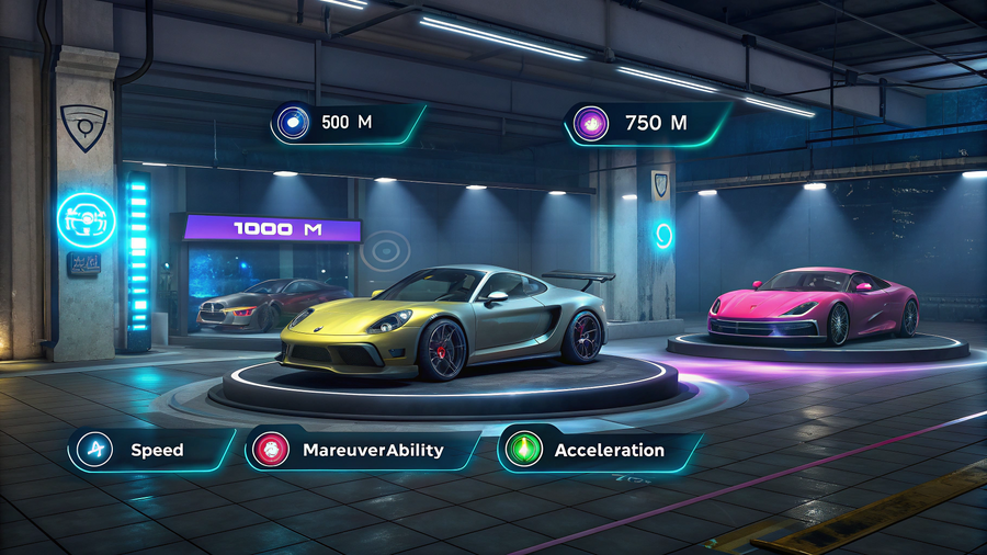 3. video game garage interface, showroom with three sleek sports cars on rotating platforms, price tags showing «500 M» «750 M» «1000 M» in game currency, upgrade buttons «Speed» «maneuverability» «acceleration», neon blue 1A14D9 and magenta F20F62 UI elements, dark background 0C0B26, cyberpunk aesthetic, unreal engine 5 --ar 16:9 --style raw