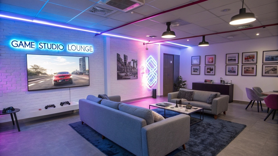 4. creative game studio lounge area, comfortable modern furniture, large screen displaying gameplay footage of car chase sequence, neon logo F20F62 glowing on feature wall, game controllers on table, concept art sketches framed on walls, developers discussing project, moody lighting with blue 1A14D9 and magenta accents --ar 16:9