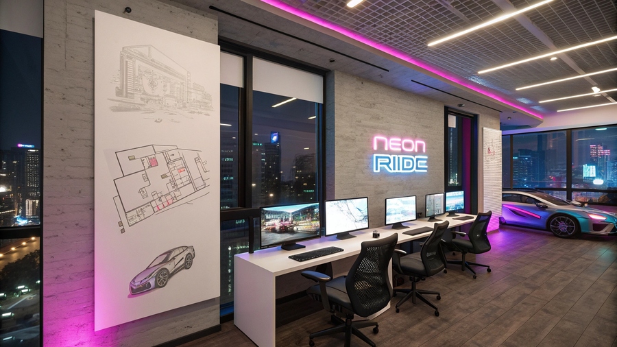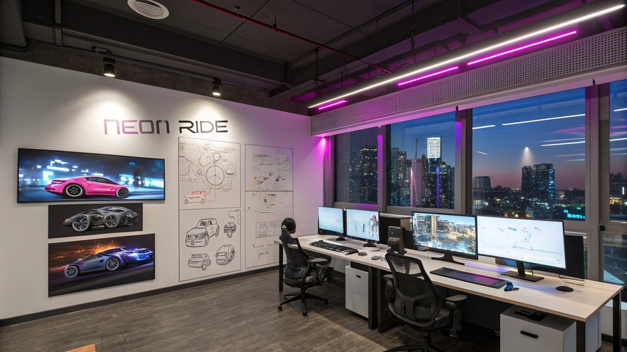 1. modern game development studio interior, open-plan workspace with sleek desks, multiple computer monitors showing concept art of cyberpunk city and car designs, whiteboards with game design diagrams, «NEON RIDE» logo F20F62 prominently displayed on wall, developers collaborating, vibrant magenta F20F62 and blue 1A14D9 accent lighting, large windows showing night cityscape, professional gaming company atmosphere --ar 16:9 --style raw