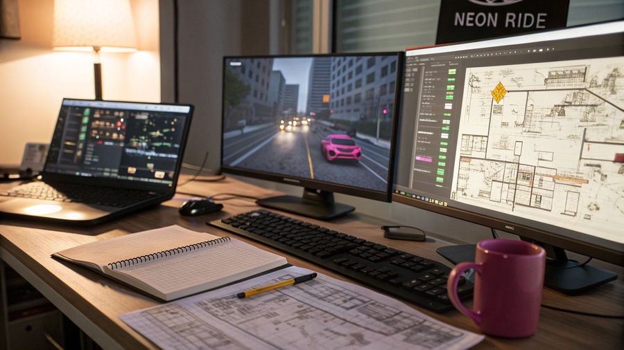 5. close-up shot of game designer’s workstation, three monitors showing: left — level design of city streets, center — pursuit mechanics flowchart, right — car upgrade interface, notebook with sketches, «NEON RIDE» style guide visible, magenta coffee mug, professional game development setup --ar 16:9