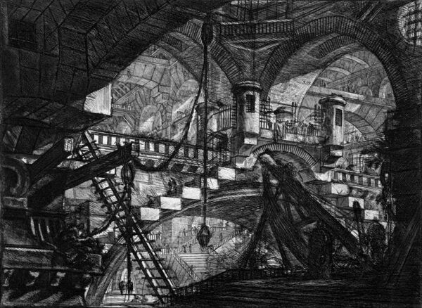 На гравюрах серии «Фантастические тюрьмы» («Carceri d’invenzione») мы видим бесконечные лестницы, ведущие в никуда, гигантские механизмы неясного назначения, арки, нависающие над крошечными фигурками людей. Пространство иррационально и непостижимо. Писатель Олдос Хаксли прямо сравнивал мир «Фантастических тюрем» Пиранези с мирами Кафки. Атмосферу серии часто описывают как «кафкианскую» (Kafkaesque), отмечая её абсурдность и ощущение безысходности.