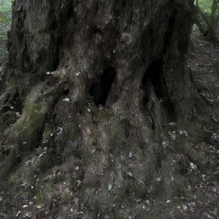 Промт 2: «photo photography of nature and plants, a hollowed ancient tree trunk, now transformed into a mystical dark forest portal with bioluminescent fungi, twisted roots, mysterious glow and enchanted atmosphere»