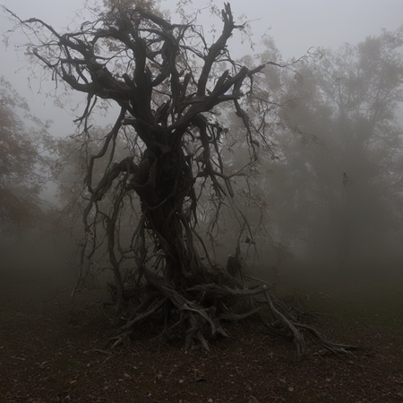 Промт 2: «photo photography of nature and plants, a twisted dead tree with broken branches, now transformed into a terrifying scene with skeletal hands emerging from the ground, ghostly figures in the fog, blood-red moon and overwhelming dread»
