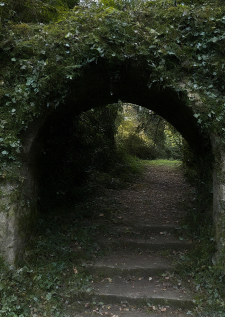 Промт 1: «photo photography of nature and plants, an ancient stone archway covered in ivy and moss, now transformed into a mysterious gateway to a dark enchanted forest with eerie glow, twisted vines and mystical atmosphere»
