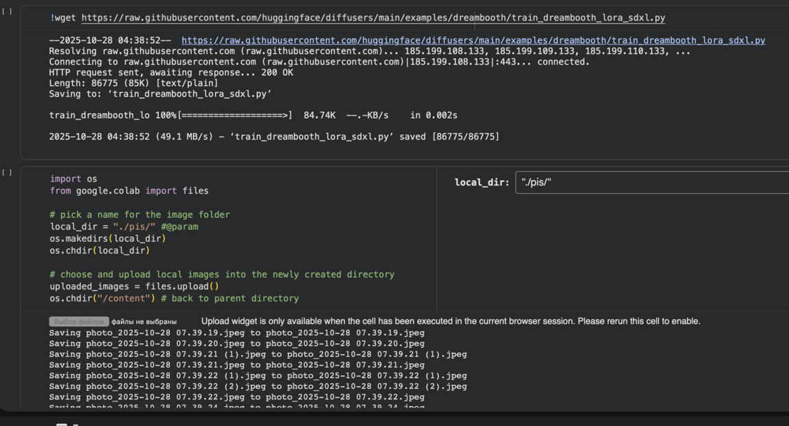 Первым шагом стала установка всех инструментов, необходимых для работы модели — таких как Diffusers, DreamBooth и другие. Затем изображения были перенесены с локального компьютера в Google Colab при помощи встроенного механизма загрузки файлов. После этого нужно было проверить, что файлы действительно появились в среде и готовы к использованию.