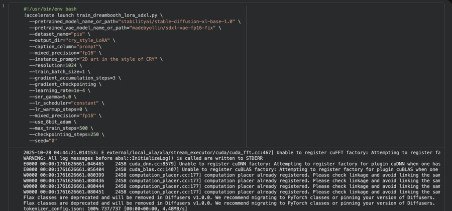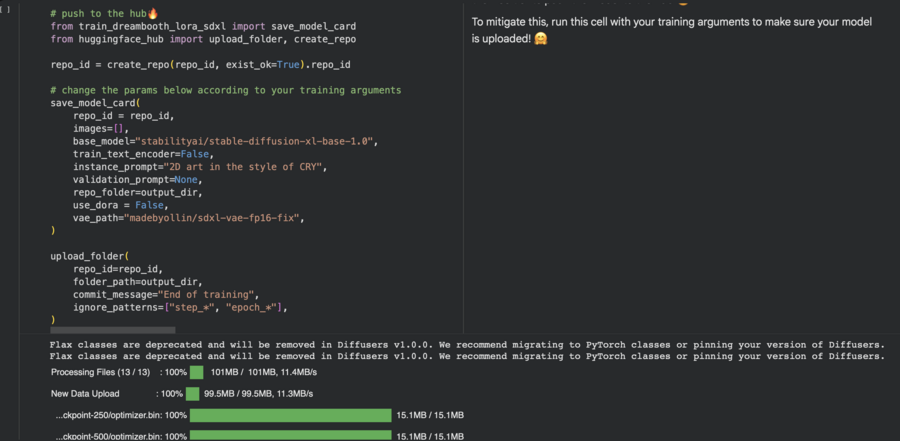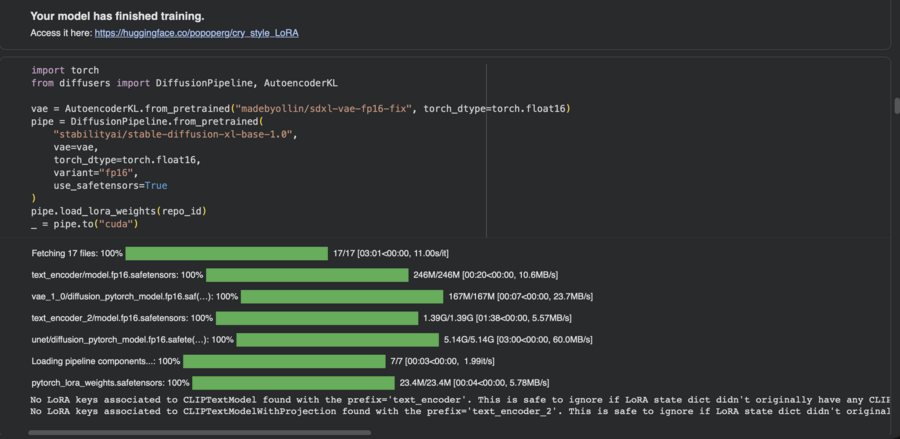 Теперь можно сохранить модель на все тот же HuggingFace, а затем начать генерацию.