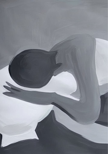 промпт 3: «2D art in the style of CRY, two abstract human silhouettes intertwined in conflict, grayscale painting, strong body tension, high contrast» промпт 4: «2D art in the style of CRY, abstract grayscale human figure hugging itself, emotional symbolism, curved lines, soft shadows, minimalist backgroun»