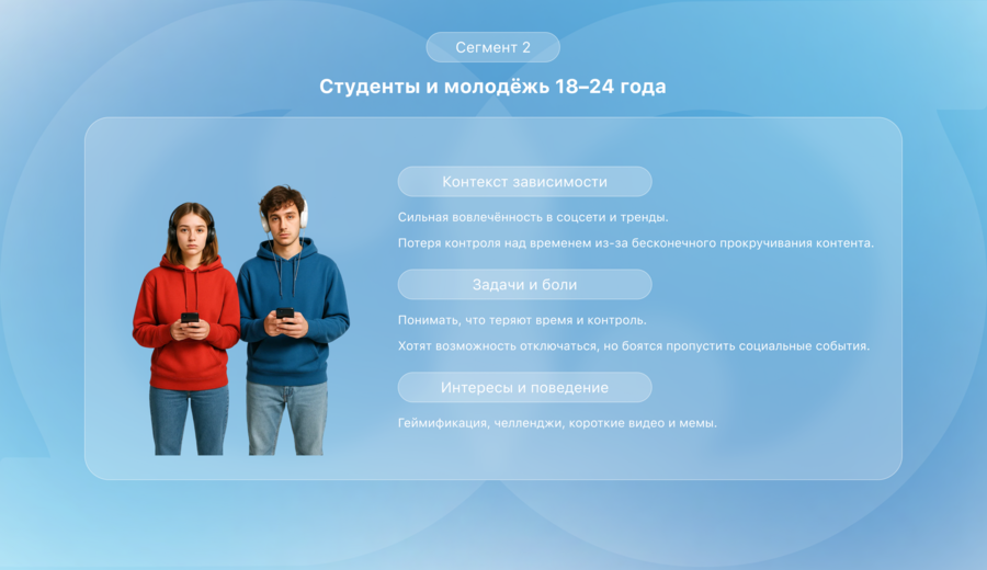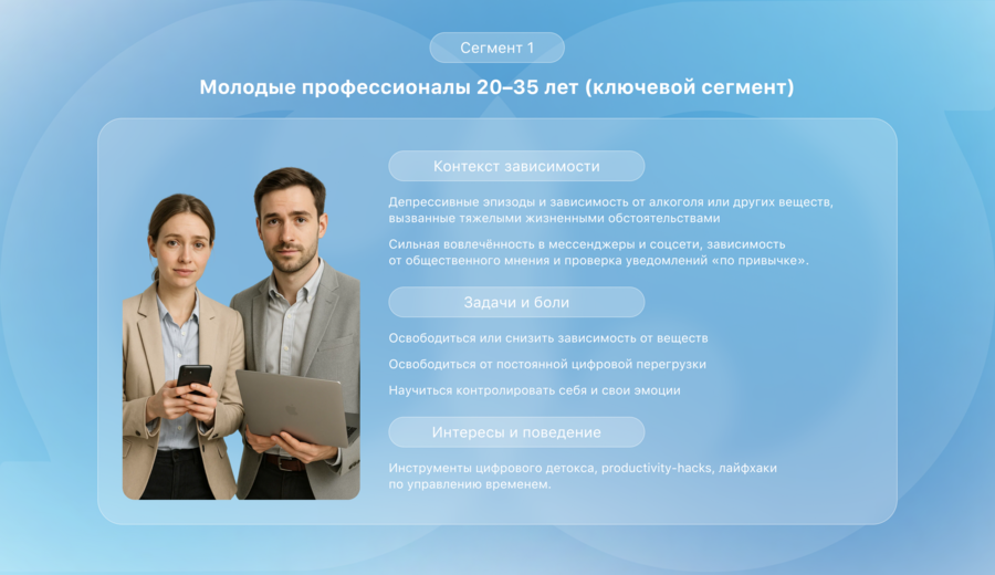 Таким образом, выбранная тема отвечает актуальности, так как затрагивает реальные психологические трудности, связанные с зависимостью и необходимостью в конфиденциальной, анонимной и безопасной платформе. Проект направлен на работу с первой целевой группой, где наиболее выражена потребность в поддержке и восстановлении внутреннего баланса.