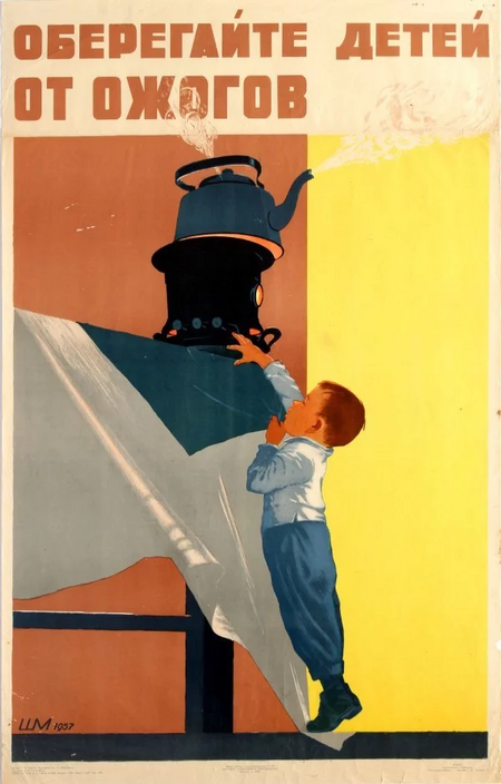 Те постеры, что предупреждали о бытовых опасностях, изображали несчастные случаи и правила безопасности не настолько шокирующе, как это делали плакаты по технике безопасности на рабочем месте. Во-первых потому, что риски меньше, а во-вторых, потому что плакаты видели и дети. Они же и выступали в роли главных героев на плакатах, которые обычно изображали несчастные случаи, произошедшие по неосторожности детей или родителей, не уследившими за детьми.