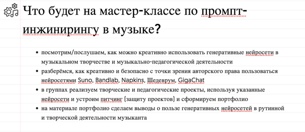 Мастер-класс «От рутины к искусству» предлагает вспомнить ваши рутинные повседневные задачи — не более пяти, приоритизировать их, выбрав одну административно-педагогическую и одну музыкально-творческую, и создать для них автоматизированные логические решения с помощью нейросетей, компьютера / мобильного телефона и вашей собственной креативности.