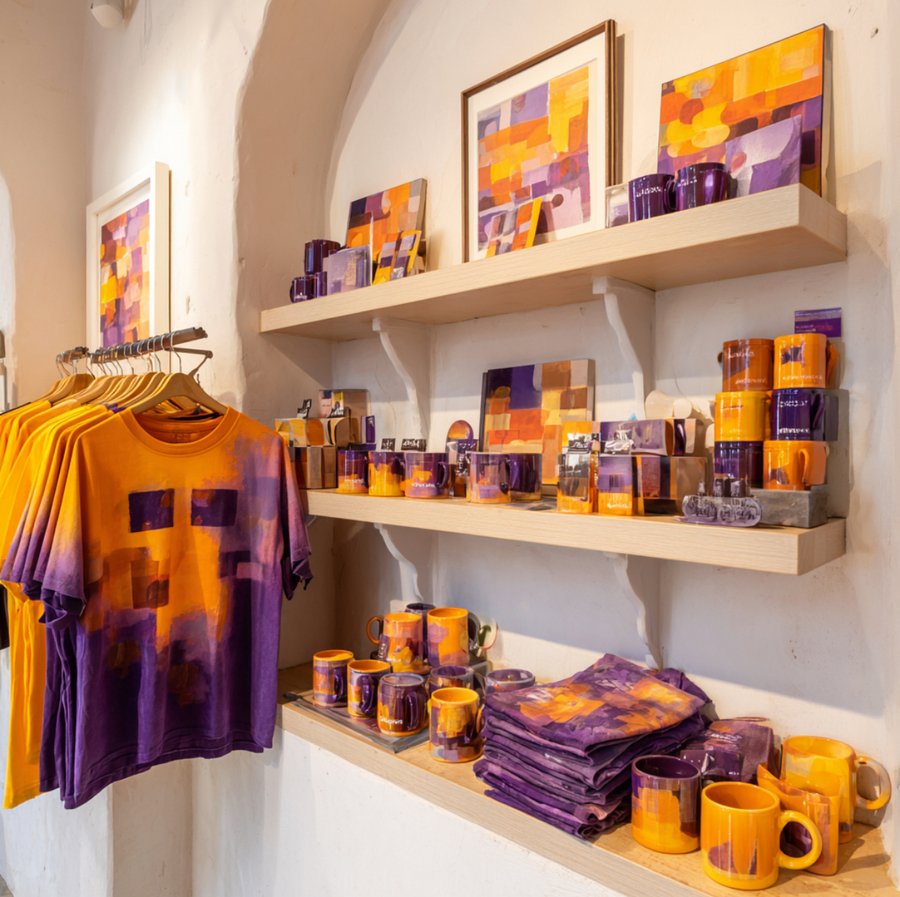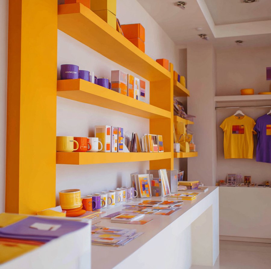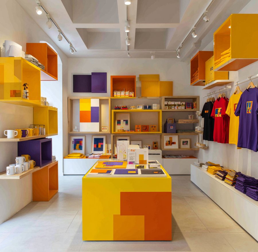 Promt: Showroom of the artist Paul Klee In yellow, purple and orange tones. Bright warm accents on a white background. The walls are white. A realistic image. On the shelves are products: t-shirts, mugs, souvenirs. Bright products. Children’s style.